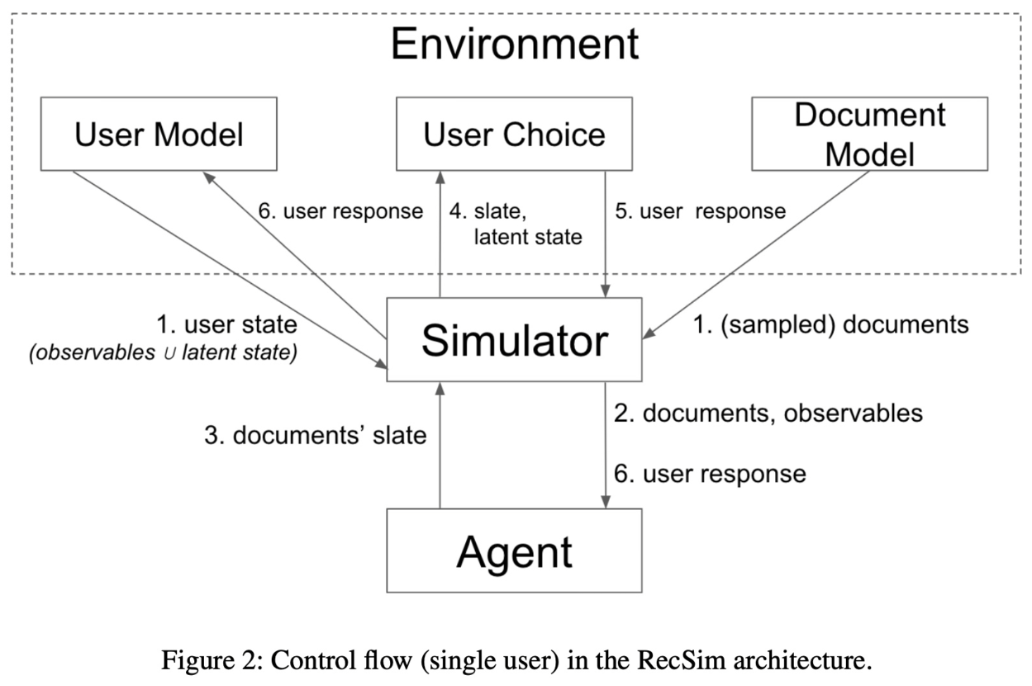 Google RecSim은 유저와의 연속적인 상호작용을 지원하는 추천 시스템에 대한 시뮬레이션 environment로, youtube 추천 알고리즘을 위해 개발되었습니다. 아래는 RecSim 아키텍쳐를 나타내는 그림으로 지금까지 설명한 내용을 한번에 보여주고 있습니다.