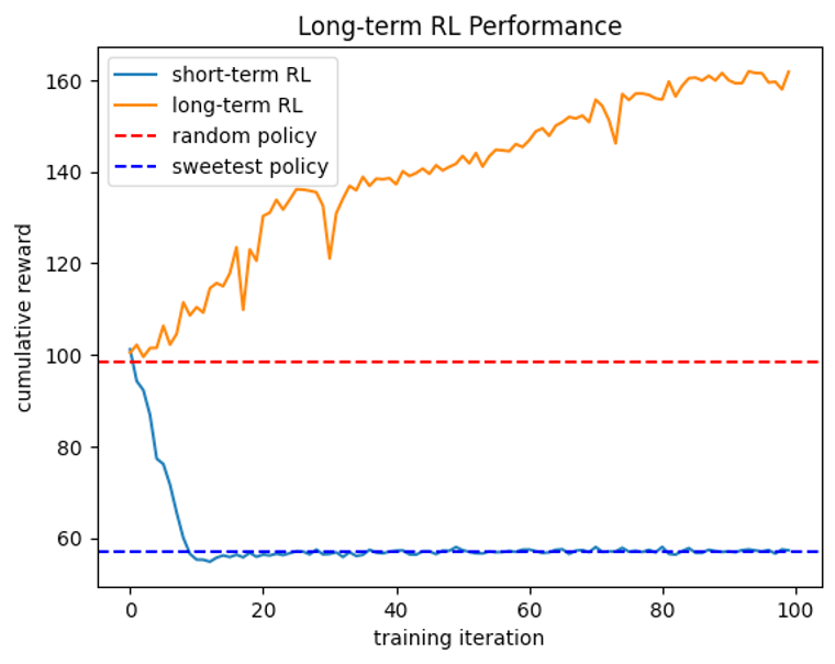 short-term RL은 학습 결과 sweetest policy와 유사해집니다. 이는 너무 당연한게, 유저들은 대체적으로 달콤한 음식을 선호하기 때문에 즉각적인 reward가 높기 때문입니다. long-term RL은 future reward도 고려하기 때문에 결과적으로 cumulative reward가 가장 높습니다.