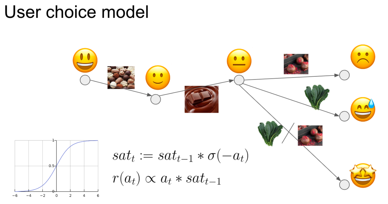 초콜릿과 케일 (채소)이 여러 개 있습니다. 우리는 초콜릿과 케일 중 어떤 것을 추천해야 유저가 만족할까를 고민하고 있습니다. 초콜릿은 단 맛이고, 케일은 쓴 맛이기 때문에 초콜릿과 케일을 달콤함 (sweetness)로 나타낼 수 있습니다. 여기서는 단순함을 위해 달콤함만 고려합시다. 유저들은 대체적으로 쓴 음식보다는 달콤한 음식을 선호할 것입니다. 우리가 생각해볼 수 있는 방법은 달콤한 음식만 추천하는 것입니다. 그러나 달콤한 음식만 추천하다보면 유저들은 점점 만족스러워하지 않을 것입니다. 왜냐하면 자신의 건강 역시 생각하기 떄문이죠. 따라서 유저들은 달콤한 음식보다는 건강에 좋은 달콤하지 않은 음식을 점점 더 선호하게 될 가능성이 있습니다. 그러나 대체적으로 달콤한 음식을 선호하는 유저들이 지속적으로 쓴 음식만 추천 받는다면 역시 불만족스럽겠죠. 이러한 요소들을 종합하면 우리의 가설은 다음과 같습니다: 유저들은 대체적으로 달콤한 음식을 선호하지만, 시간이 지나면서 점점 달콤한 음식의 선호도가 내려가기 때문에 중간 중간 달콥하지 않은 음식도 추천 받길 원한다.